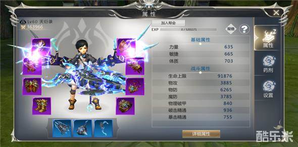 玩家点击进入属性界面,可以看到角色的基础属性以及装备信息,角色的基础属性包括三项:力量、敏捷和体质。