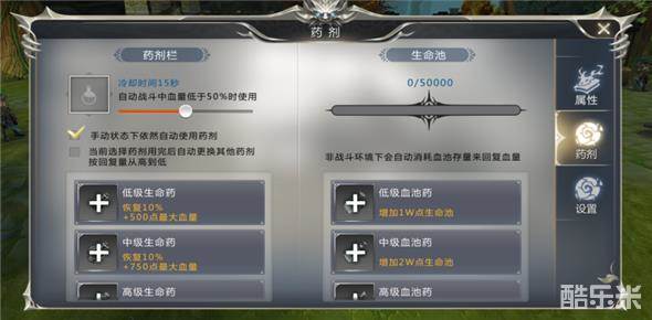 游戏内的药剂系统分为药剂栏和生命池。药剂栏为点击装备后,会在主界面显示药剂按钮。而生命池,则为生命值储备池,非战斗状态下会自动使用生命池内的储备生命值回血。