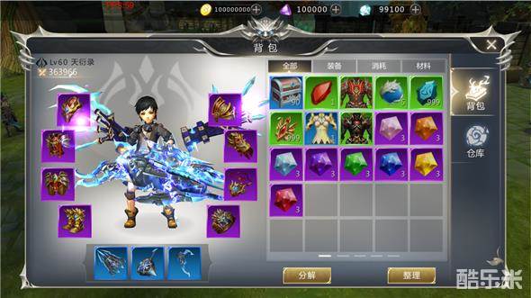 通过点击,打开角色的背包。背包作为玩家在游戏内获得道具的存放地,显示所有已获得道具的信息。背包内同时显示玩家角色装备的信息,而背包内也显示玩家货币的剩余信息。