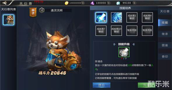 每只天衍兽都可以进行技能学习,在天衍兽技能页面中,可以看到已学习或者待解锁的技能格,已经学习的技能可以通过使用一定数量的与该技能相同的技能书进行升级,如果想要替换技能,则需要先将技能遗忘,然后再进行学习。