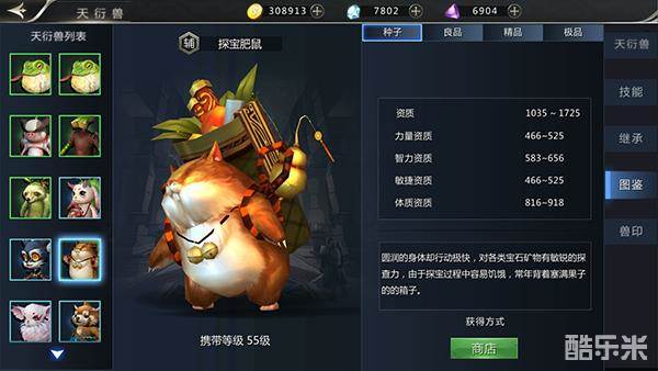 在图签界面中,可以看到目前版本中的天衍兽介绍,包括品质分级、各属性资质、获得方式等信息。