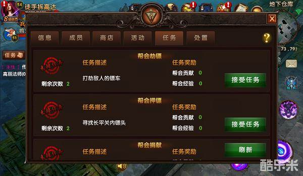 已经加入帮会的玩家,打开帮会界面,点击任务标签,就可以看到帮会押镖任务,这里当然是点击接受任务了。