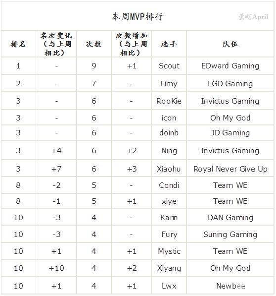 WE在本周一胜一负,Xiye MVP次数加一,与队友Condi并列第八。同时Mystic也在本周获得了一次MVP,闯入MVP榜前十。