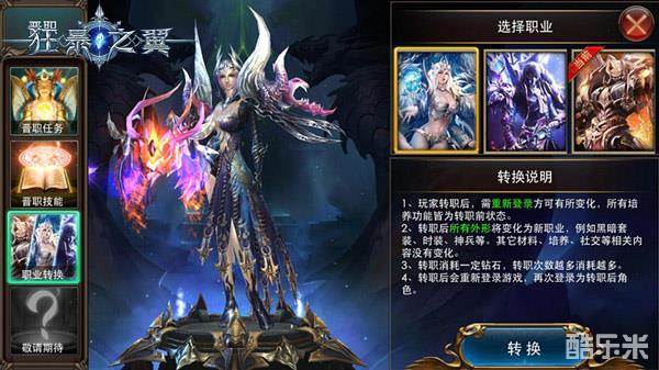 玩腻了远程攻击的魔法师,想体验一下近战爆发流的狂战士?没问题,《狂暴之翼》给你自由选择的权利。只要玩家达到78级,消耗一定的钻石即可转换成喜爱的职业,感受“第二人生”的乐趣,避免了重复练级的烦恼。转职完成后,玩家再次登录游戏即可看到新的职业形象,当前装备自动转换为对应职业的装备,且所有养成和属性保持不变。