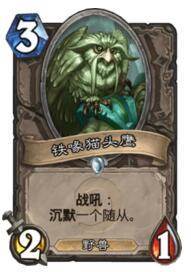 因为我们偏向于进攻性,所以很多时候随从就是要过墙斩杀对手,以及在这之前需要进行控场,保证我们随从可以安稳输出,所以一只猫头鹰必不可少,遇到对手的墙可以轻松过墙斩杀,而在没有盾猛这张单解的时候,面对对手“自带嘲讽”的生物,我们也可以一个沉默先处理一下,免得被随从效果打崩,比如猎人的肖尔……。