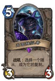 可以复制任何随从,所以遇到对手个别高质量随从的时候,我们可以复制一波,强行五五开,但这只能说是劣势迫不得已的做法,通常情况下我们这个无面适用于增大场面压力的,因为我们的暴乱狂战士和腐树巨人上限都很高,一旦成型,无面一直场面压力就翻倍,对手拿不出足够的解那就分分钟爆炸,另外也可以复制魔块,让场面更恶心。说到这里大家应该都知道这套牌中无面的缺陷了,即略显卡手。