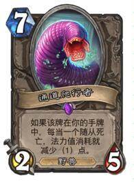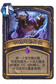 这张卡在这套牌中是非常神奇的存在,因为他的原因我们这套牌全随从,就是为了多交换场面,让他可以0费下,因为卡牌上写的是7费,,这样就可以配合不稳定异变进化成8费,巫妖王、始生幼龙什么的都不错,1费就可以造出这样大号的随从,节奏感巨强。
