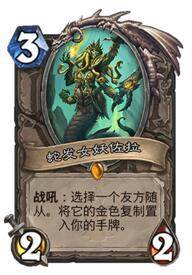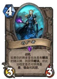为了给他圣盾、吸血、嘲讽、风怒,我们带来奇利亚斯和奥拉基保证这个4费3/3可以获得这些属性,那么4费准时下场就能带来很大的场面优势,无论打快攻还是控制卡组效果都不错,实战中也推荐大家起手去找,并且尽快入场,因为能让这张卡获得效果的卡主要是奥拉基和奇利亚斯,如果这两张卡上手了就大事不妙了,夺尸者就变成3/3白板了,最多就剩下一个嘲讽,也是废了,所以尽早使用确保收益。