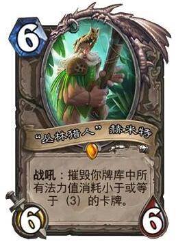 “丛林猎人”赫米特一看效果就知道是特殊卡组的“过牌”(滤牌)神器。元气骑、OTK卡组包括战吼萨都会带赫米特,本身身材不差,是一张很有用的牌。但是除非特别想玩某种卡组而且不缺卡,否则不推荐合,并且OTK很多是娱乐卡组,玩个爽就好。