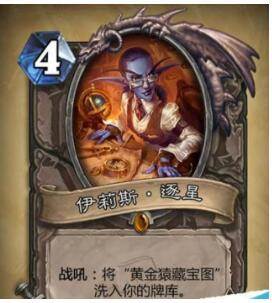 探险家版本的伊莉斯,身材标准,效果强大。不过这个挖宝要先找到藏宝图,之后才能找到黄金猿。算是很后期而且有剩余资源变橙卡的卡组才能玩,一般都是战士和牧师带,战士现在有亡者之牌;牧师有各种补牌手段,偷也好,刷也好。如果想玩双挖宝卡组那推荐买一个探险家冒险,附赠铜须、小爵士(板娘)。