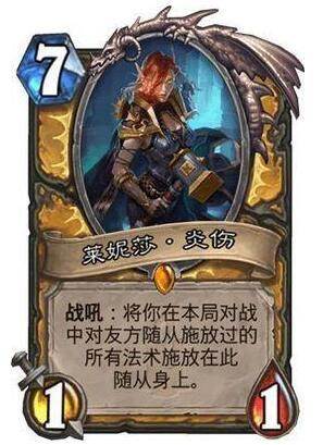 莱妮莎炎伤卡牌效果:7费1-1,战吼:对该随从施放你在本局对战中施放在友方随从上的所有法术。这张卡效果惊人就是太怕沉默!