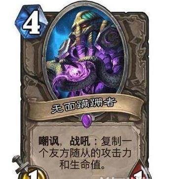 宇宙术手牌术的御用随从,一般复制场上高血量的随从,附送一个嘲讽特效。是术士抵挡对方随从进攻的最强盾牌。在炉石传说的对局中,一般看到的是一个8-8(山岭巨人复制)或者4-10(暮光幼龙复制)的无面蹒跚者。所有的对面玩家只能望着这堵大墙,却无可奈何。