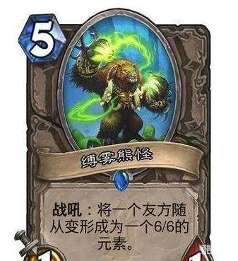 中立稀有 5费1/1 战吼:使一个友方随从变形为6/6元素。不过看它的特效,随便变一个友方随从变成6-6的元素,其实也不错,符合条件的话还算是稍微超模的效果。