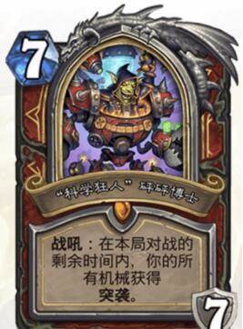 战士新的英雄卡带来的英雄技能是多变性的,比方说:三个带突袭的1/1适合着配合解场;一个加强版的魔爆术可以对英雄也造成伤害,同时方便解场一些报告兵之类的;或是叠七点甲,这可比强化后的战士技能还要厉害;又或者是发现一张机械牌,能在你最需要的时候找到一张最适合的机械牌来对场面进行补充。可以说新战士英雄卡“科学狂人”的技能可以说是非常强势了,只可惜不能选择在合适的时间用合适的,而是靠随机,这就很看脸了!