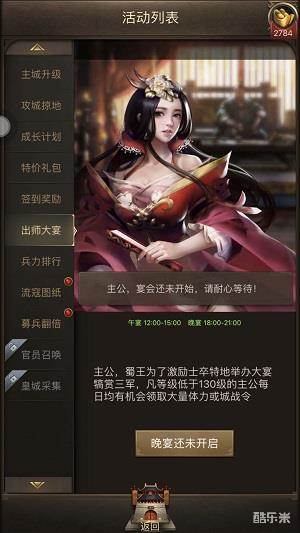 你们的王为了激励各位士卒,特地在每日12:00-15:00和18:00-21:00准备了丰盛的午宴和晚宴来犒赏大家。凡等级低于130级的主公,每日均有机会领取到大量的体力值或城战令,助你战场杀敌一臂之力!