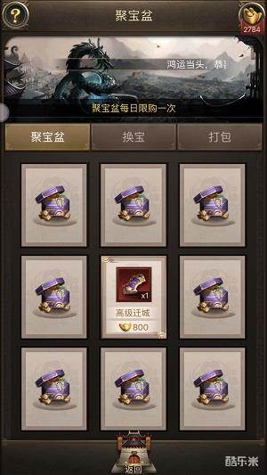 每天聚聚宝,淘到宝贝就是赚!游戏内,聚宝盆每日将会放置8个宝袋和一个道具,各位主公均可直接购买。每个宝袋内将会放置不同价值的道具,每隔一个小时能打开宝袋查看其中的物品哦。