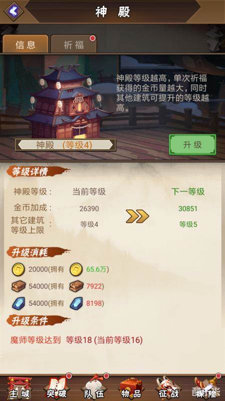 概述:神殿主要作用于获取金币收益,并且是升级其他建筑的重要元素。只有当神殿达到一定等级后,才可满足条件对其他建筑进行升级。神殿分为信息介绍和祈福两部分。当魔师达到12级,可开启神殿功能。