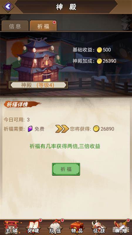 每日的祈福次数有限,首次祈福免费,后续每次祈福需要支付钻石。祈福有几率获得两倍、三倍收益。