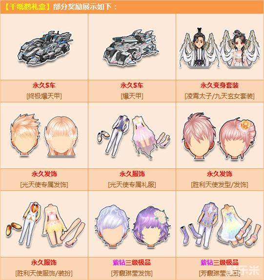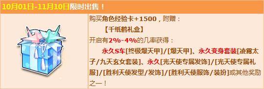 10月1日-11月10日期间,购【角色经验卡+1500】,赠送【千纸鹤礼盒】,有机会得永久S车【终极爆天甲】/【爆天甲】、永久变身套装【凌霄太子/九天玄女套装】、永久【光天使专属发饰】/【光天使专属礼服】/【胜利天使发型/发饰】/【胜利天使服饰/装扮】或其他奖励之一!其中核心奖励期限型概率为:4%-6%,核心奖励永久型概率为2%-4%,非核心奖励概率为:90%-94%。