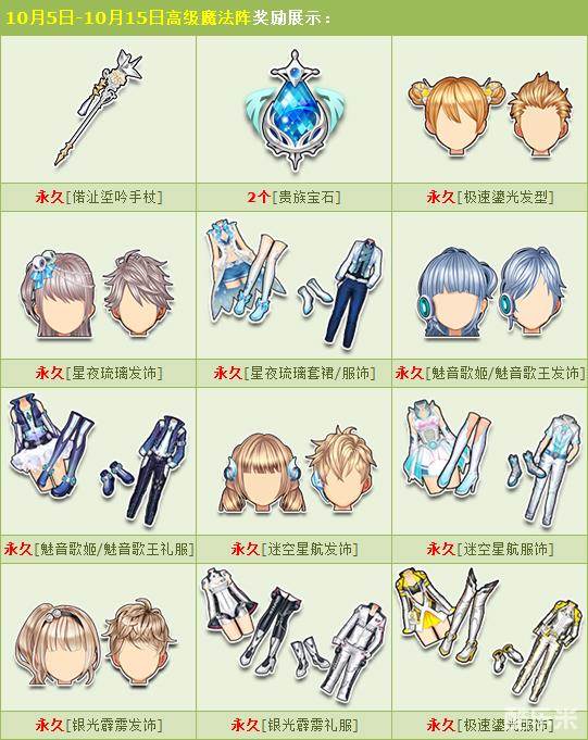 10月5日-10月15日期间,高级魔法阵奖励全面更新,多套人气永久服饰等你来抢,还有贵族宝石、精美手杖奖励多多,千万不要错过哦!