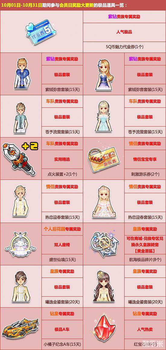 国庆极品狂欢,每月1日为飞车【会员日】,魅力达人-特权感恩礼将每月1号定期更新!10月1日-10月31日,5Q币魅力代金券、极品双人座椅【盛世仙境】、极品A车【小橘子纪念A车】、极品套装【曦逸金鎏套装】等豪华奖励免费尊享,极品轻松领!不再是梦!
