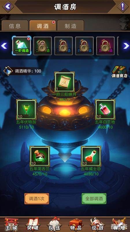 在探险挂机中,会随机掉落调酒材料,材料等级与魔师的突破等级挂钩。凑齐以下五种材料,便可进行调酒。调酒成功随机获得不同颜色的名酒*1,调酒失败获得名酒精华*50,名酒精华可在名酒商店购买成品名酒。