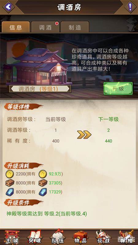调酒房:在调酒房中可以合成各种珍奇道具,调酒房等级越高,可合成种类以及稀有道具产出率越大!