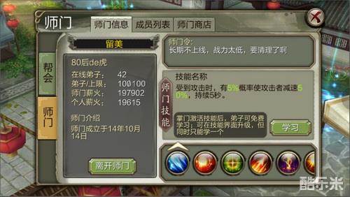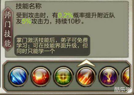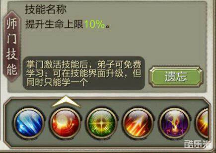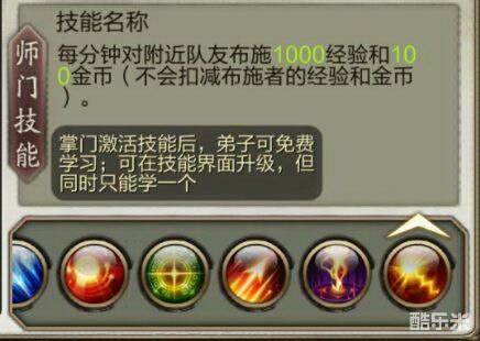 加入师门最大的好处就是能学习一个新的技能,师门技能一共有六种,不过很可惜,一个师门目前只能激活一种技能,所以各位师门掌门得自己定夺。激活技能和学习技能都需要消耗薪火,而薪火只要在线就能获取,跟真气获取类似。激活技能需要消耗掌门的个人薪火,一个技能需要消耗1000多薪火,小编一直感觉这里很坑,为什么不是消耗师门薪火呢。这里推荐学习血量上限这个技能。师门技能学习后,还能在角色技能那边升级,就跟其他技能升级一样,不过消耗的是薪火就是。下面上几张师门的技能图。