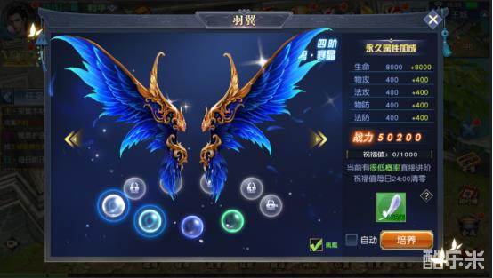 羽翼开启后,由主界面右下方的“羽翼”按钮点击进入