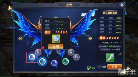 点击羽翼下方的羽翼丹即可打开羽翼丹培养界面,使用羽翼属性丹培养羽翼丹可以提高羽翼战力属性