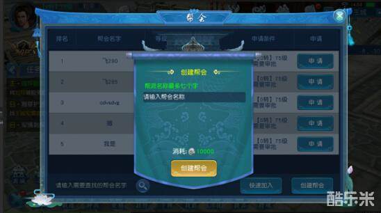 1、上面显示帮会排名、名字、等级、成员数量、申请条件以及申请按钮