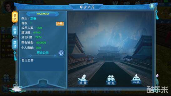 5、加入帮会后点击帮会进入到帮会大厅界面,帮会大厅分信息、成员、活动分页