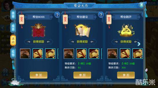 7、信息分页显示帮会各项信息、成员分页显示帮会成员及事件、活动分页显示帮会活动,含帮会boss、帮会建设、帮会跑环、帮会采集等