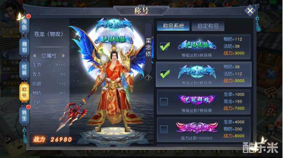 可以通过游戏内的各种活动玩法获取角色称号,每激活一个角色称号都将提供一定数值的战力属性加成。玩家通过国战系统将获得独特的官衔称号,官衔称号也将提供战力属性加成。