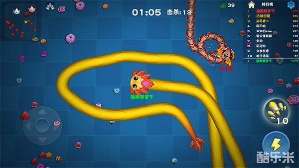 游戏里经常出现群蛇混战的局面,你可以跟随一条大蛇的尾巴前进,等大蛇死掉后立马吃掉尸体变成的大糖果。