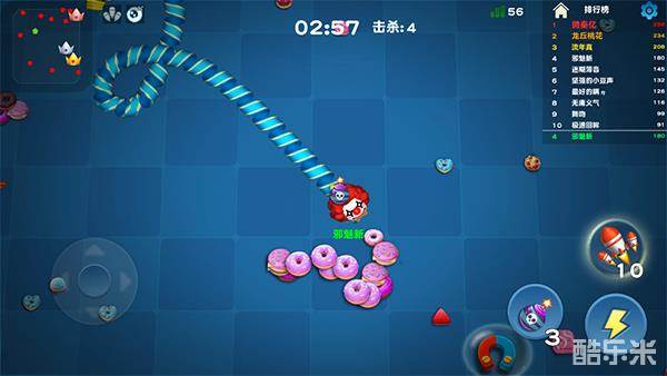 4、通过巧妙的走位让其他蛇蛇撞到自己的身体,吃掉它们化成的大糖果,可以迅速让自己长大;