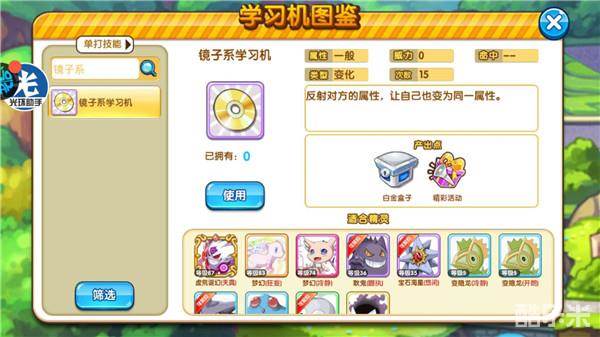 首先,镜子系玩法的核心正是上图这个学习机,目前复刻还没有售卖过,只能白金盒子靠运气开出来。镜子系的作用就是使自身变成对面相同的属性,而一般来讲多数精灵是带收益大的本系技能为主的,但多些本属性的招式很多却是自我抵抗的,比如恶系抵抗恶系、超能抵抗超能、火系抵抗火系等等。镜子系正是利用了这个原理,让自身属性变得跟对面一致,从而使得对面的本系技能对上反射属性后的自己打不出伤害来,并且在踩影子的作用下只能选择站撸却无法逃跑。