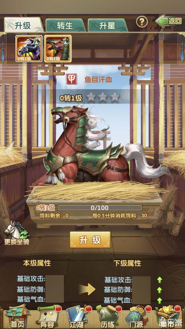 若是掌门的马厩里有了一匹以上的同名马驹,则可进行升星。升星会消耗掉一匹同名马,但会大幅提升马匹的天赋效果。此外,掌门还可进行继承操作,也就是将一匹马驹的经验继承给另外一匹,但被继承的马驹必须是0经验的初始小马,而继承马则必须是有一定经验值的马驹。继承成功后,继承马驹的经验和转生等级直接转移到被继承马的身上。