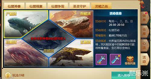 鲲之大,不知其几千里也!没错,“灵鲲之战”的主角就是只存在于神话传说中的“鲲”,实力之强可想而知!道友们需要尽量集齐全盟之力,联手击杀外围鲲区域中的巨鲲、尸鲲、骨鲲、玄鲲,成功的仙盟便进入灵鲲区域挑战最终boss。其中,每次消灭一只“鲲”首领,仙盟的每位玩家都会获得宝石、进阶材料等珍贵物品,灵鲲区域更有“神魔套装”现世,简直爽歪歪哦!