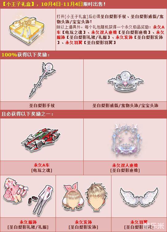 【小王子礼盒】,10月4日-11月4日限时出售!打开【小王子礼盒】后必得圣白梨影手杖、圣白梨影戒指/宠物头饰/宝宝头饰!除以上道具外,每个礼包随机获得一个永久极品奖励:永久A车【电玩之魂】、永久双人座椅【圣白梨影座椅】、永久服饰【圣白梨影礼裙/礼服】、永久发饰【圣白梨影发饰】、永久羽翼【圣白梨影羽翼】