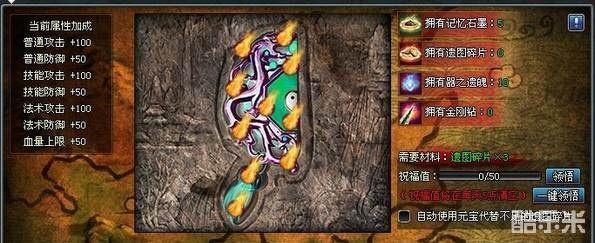 3.武学根基达到90级,通过游历、探索可获得遗图碎片,每天最多获得10个,遗图碎片可突破古器阶段。