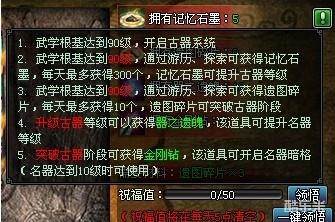 2.武学根基达到90级,通过游历、探索可获得记忆石墨,每天可最多获得300个,记忆石墨可提升古器等级