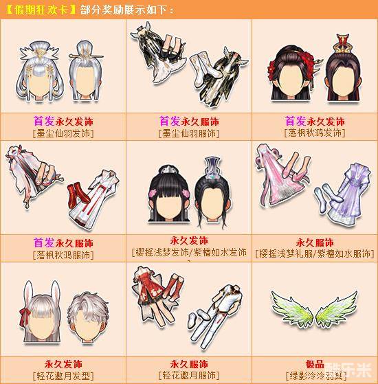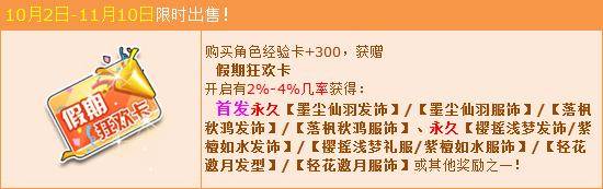 10月2日-11月10日购买角色经验卡+300,获赠:假期狂欢卡,开启有几率获得:首发永久【墨尘仙羽发饰】/【墨尘仙羽服饰】/【落枫秋鸿发饰】/【落枫秋鸿服饰】、永久【樱摇浅梦发饰/紫檀如水发饰】/【樱摇浅梦礼服/紫檀如水服饰】/【轻花邀月发型】/【轻花邀月服饰】或其他奖励之一!获得核心奖励永久型概率是:2%-4%,获得核心奖励期限型概率是:4%-6%,获得非核心奖励概率是:90%-94%。