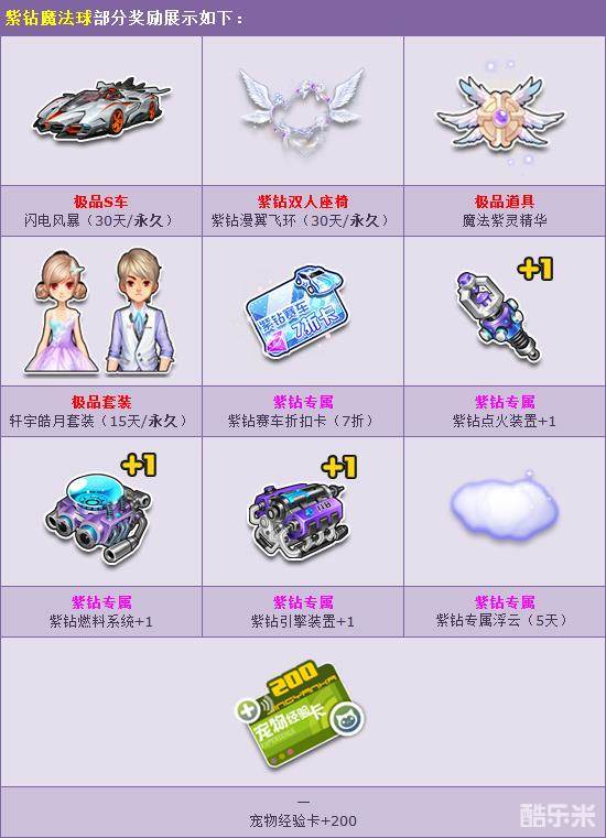 10月7日起,紫钻魔法球奖励全面更新,永久S闪电风暴、紫钻双人座椅紫钻漫翼飞环、极品宠魔法紫灵等一系列好礼等你来拿,千万不要错过哦!