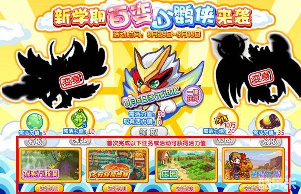 进入活动界面,领取小鹦侠需要30个活力值,我们要去界面下方指定的任务或者活动中获得活力值!