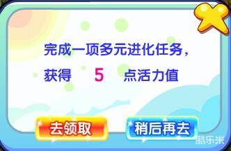 当我们首次完成随机任务或活动可获得5点活力值,点击左下角的“去领取”,就能回到活动乐园领取活力值。