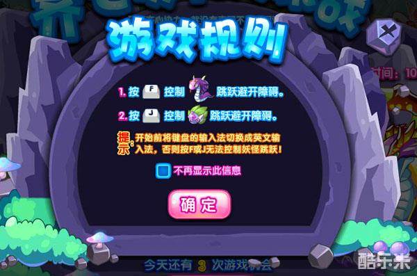 每个卡布每天有3次“齐心协力大挑战”游戏机会,游戏中我们要上下兼顾,按键盘F键控制紫魄蛇跳跃避开障碍,按键盘J键控制神秘小家伙跳跃避开障碍!两只妖怪一个都不落下,坚持的秒数越久获得的勋章越多!