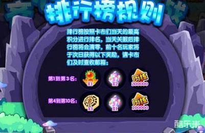 “排行榜规则”,排行榜按照卡布当天最高积分进行排名。当天关服后排行榜将会清零,前十名玩家将于次日获得以下奖励,请卡布们及时查收邮箱。