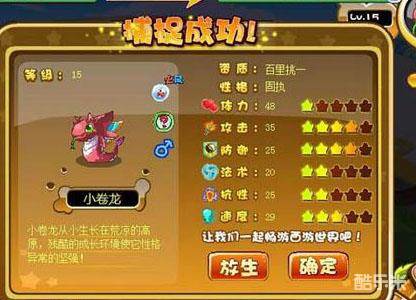 捕捉成功,小妖的这只小卷龙的资质看看也是醉了,待我去多抓几只来,卡布快来捕捉小卷龙吧!