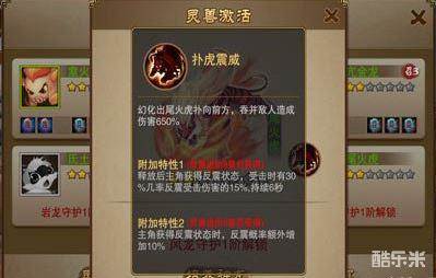 在游戏中我们尾火虎可以说是并没有愧对激活的那么多的资源,在战斗中我们的尾火虎的不仅伤害高,还有很好的保护作用。首先技能:扑虎震威幻化出尾火虎扑向前方,吞并敌人造成伤害650%。附加特性有两个分别是特性1:释放后主角获得反震状态,受击时有30%几率反震受击伤害的15%,持续6秒,特性2:主角获得反震状态时,反震概率额外增加5%。